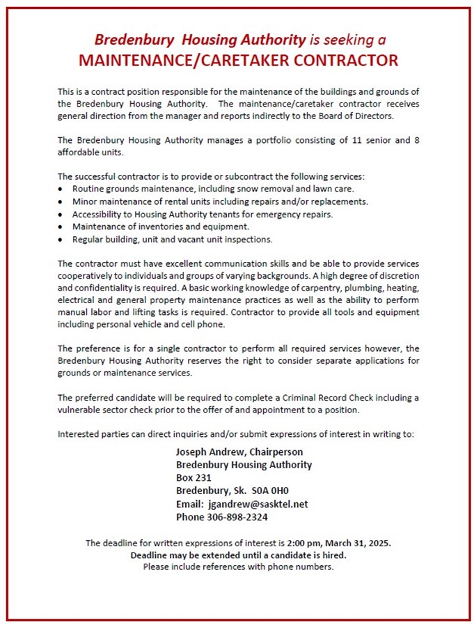 Just a couple of reminders about upcoming events: The semi-annual craft/trade show on May 10, 2025 at the Bredenbury Community Hall from 10:00 am to 2:00 pm. Tables are all booked so we should have something for everyone. Don’t forget baking for the bake table or a cash donation if baking is not your thing. We certainly appreciate the support we receive from everyone. Please have your baking at the hall by 9:00 am for pricing.